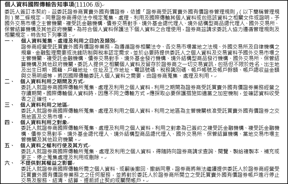 由於個人資料之蒐集,涉及客戶的隱私權益,遠智證券蒐集、處理、利用及國際傳輸客戶個人資料事宜,係依據「個人資料保護法」第8條及「歐盟一般資料保護規範」(General Data Protection Regulation,簡稱GDPR規範)第13條(如有適用)規定,向客戶告知相關事項。有關遠智證券蒐集客戶個人資料之目的、個人資料類別及個人資料利用之期間、地區、對象及方式等內容、個人資料國際傳輸告知事項等如後附表。遠智證券最新之告知義務內容,以及客戶如欲行使個人資料保護法第3條規定及GDPR規範權利之方式,得至官網查詢。